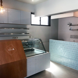 予算削減の現場の中で、タイルと目地を中心においてプランニングしましたが、急なお願いにも関わらずご協力頂いたおかげで、施主さまの作られる丁寧で素朴なお菓子に寄り添うキッチンとショーケースが完成して、私自身もとても嬉しいです。
